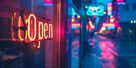 Vivid neon lights create an energetic urban atmosphere at night