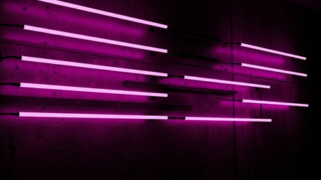 An abstract composition multiple linear neon tube lights in a vibrant magenta hue mounted on a dark, textured wall. The lights are arranged in a dynamic, seemingly random pattern, creating a striking visual effect. Each tube emits a bright, electric glow, casting a soft illumination on the surrounding dark surface. The clean lines and geometric arrangement of the lights contrast with the rough texture of the wall, creating a modern and futuristic aesthetic. evokes a sense of urban nightlife,...
