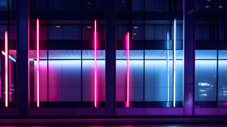 An abstract composition multiple linear neon tube lights in a vibrant magenta hue mounted on a dark, textured wall. The lights are arranged in a dynamic, seemingly random pattern, creating a striking visual effect. Each tube emits a bright, electric glow, casting a soft illumination on the surrounding dark surface. The clean lines and geometric arrangement of the lights contrast with the rough texture of the wall, creating a modern and futuristic aesthetic. evokes a sense of urban nightlife,...