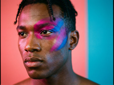 Confident young african american male model features artistic pink and blue paint strokes on his cheek while looking away against a split pink and teal colored background.