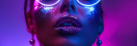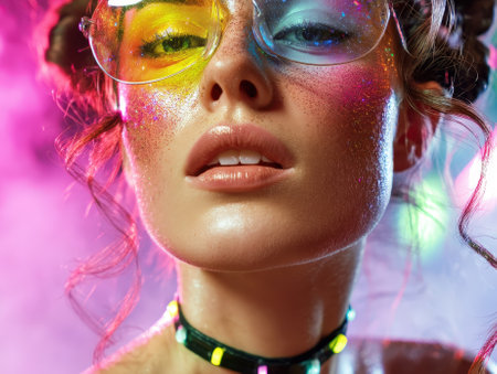 Colorful close-up of a woman's face with glitter makeup, vivid lips, and curly hair. Multi-colored eyewear reflects light. Soft-focus neon lighting enhances a vibrant atmosphere