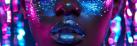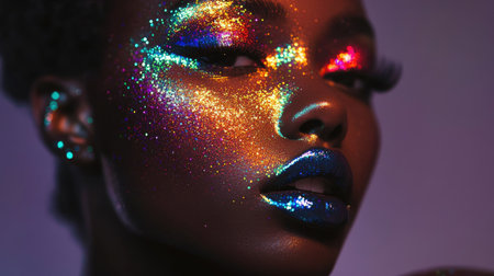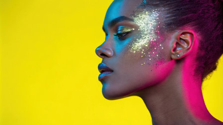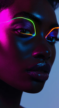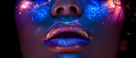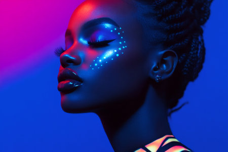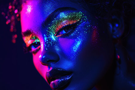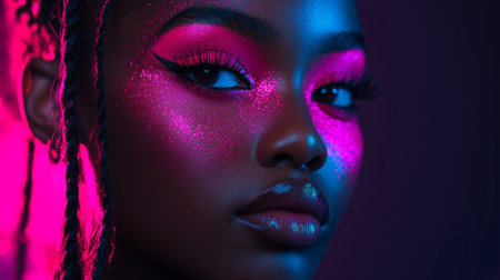 AI Generated. African female with cosmic neon glitter makeup in dark setting