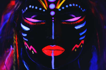 Model in image of Native american with neon makeup, which made of fluorescent paint in ultraviolet light.