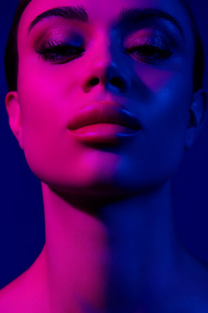 Fashion female model with creative lighting. Close up UV portrait of woman