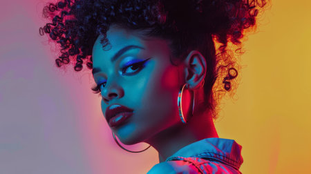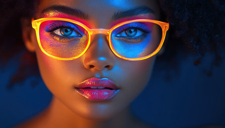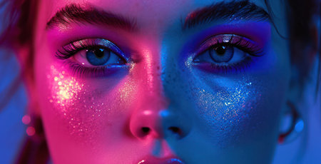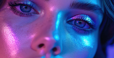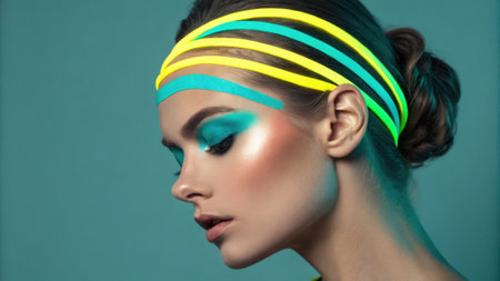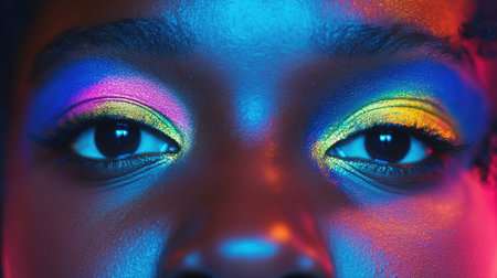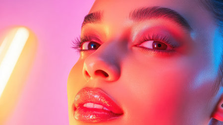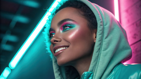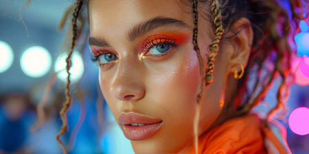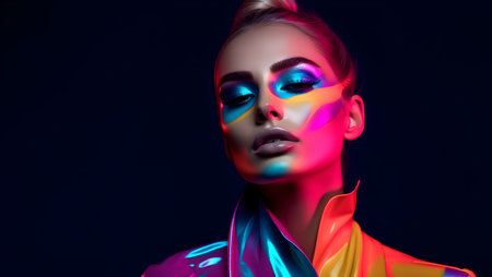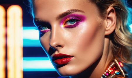 Vibrant portrait of a young woman with bold makeup and neon lighting effects