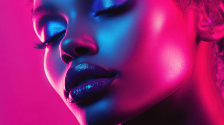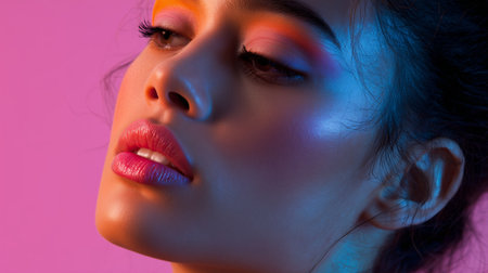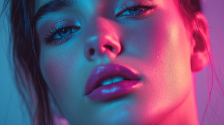 An artistic close-up portrait of a woman with glowing neon blue and pink lighting, highlighting her face with a modern and vibrant aesthetic.