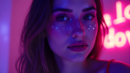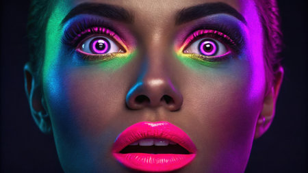 Beauty portrait featuring a young woman showcasing vibrant fluorescent makeup, glowing under striking UV light in a trendy nightlife setting