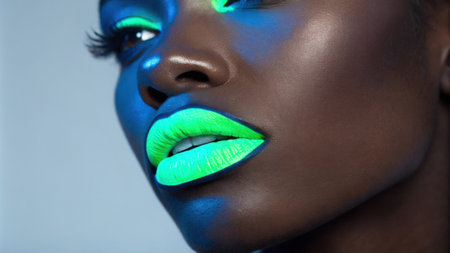 This image captures a closeup of a person with bold fluorescent green lips paired with luminescent blue highlights along the jawline creating a captivating interplay of colors that.