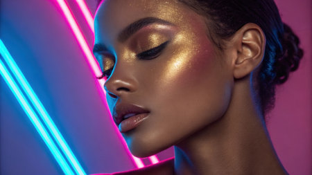 Radiant Glow The models visage is adorned with shimmering gold highlighter that catches the vibrant pink and blue neon lights creating a mesmerizing luminescence across her.