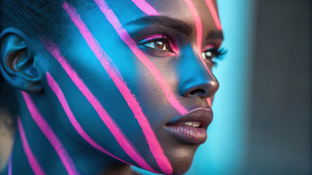 A mesmerizing portrait reveals a face with sharply defined neon stripes running vertically across the features. The electric blue and hot pink colors contrast sharply with the.