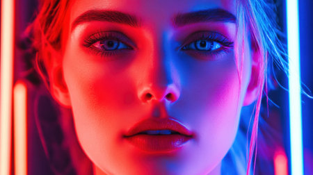 Close-up of a woman's face illuminated by vibrant red and blue neon lights, creating a dramatic and futuristic atmosphere.