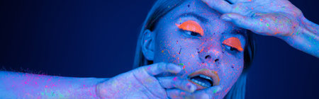sensual woman with vibrant neon makeup posing with hands near face isolated on dark blue, banner