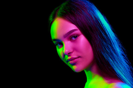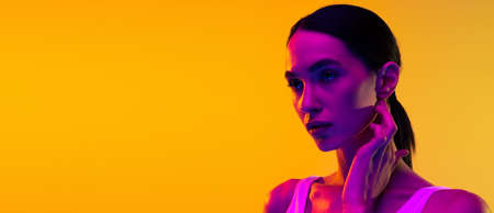 Tender. Portrait of female fashion model in neon light on dark studio background. Beautiful caucasian woman with trendy make-up and well-kept skin. Vivid style, beauty concept. Close up. Copyspace