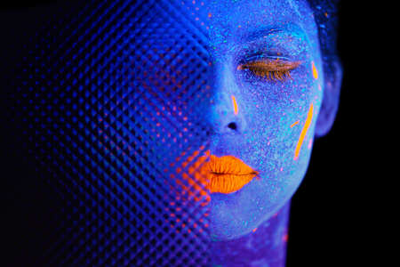 Beautiful young woman dancing and making party with fluorescent painting on her face. Neon facial portraits