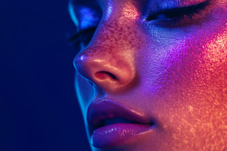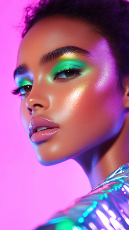 Vibrant beauty portrait featuring woman with colorful makeup and glossy highlighted skin on neon background.