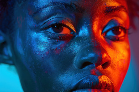 Close up of a beautiful African American woman adorned with vibrant blue and red face paint