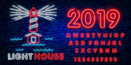 Night Club Lighthouse Neon Sign. Lighthouse Logo in Neon Style, Symbol, Design Template for Nightclub, Night Party Advertising, Discos. Neon banner. Vector illustration. Editing text neon sign