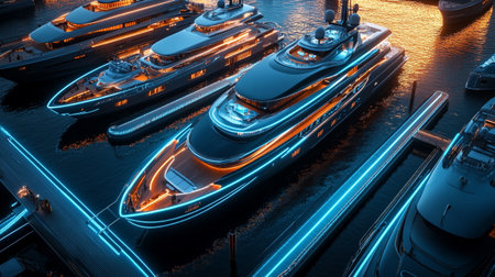 Aerial View by Drone of yacht club and marina. Top view of yacht club. Marina dock yachts and small motor boats. Yacht and sailboat is moored at the quay in blue and pink tones