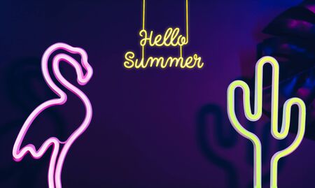 Hello Summer with pink flamingo, cactus and monstera leaf with neon pink and blue light.Vacation banner mock up space for adding text
