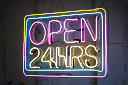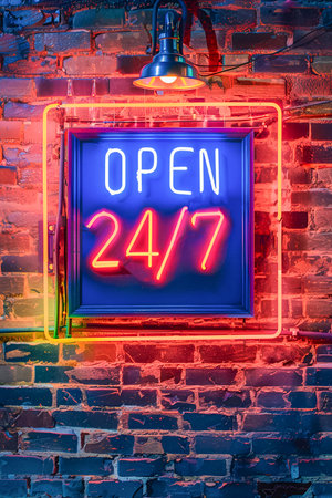 Glowing neon sign with the text OPEN 24/7 in bold, vibrant colors against a dark urban brick wall background