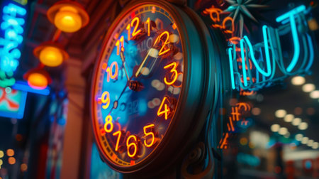 A neon sign above the clock reads Particle Decay Clock in bold glowing letters