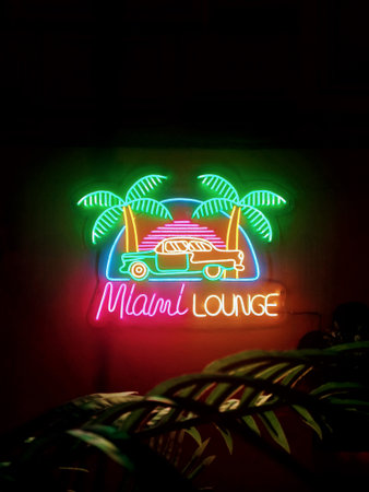 Neon sign with a retro car and palm trees in the background.