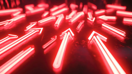 A captivating image of vibrant red neon arrows pointing upward against a dark backdrop, symbolizing growth and direction in a modern, abstract style.