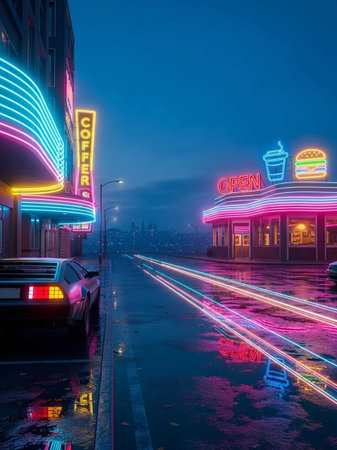 A striking array of neon outlines illustrates popular fast-food items like burgers, hot dogs, and fries on a dark backdrop, creating a lively effect.