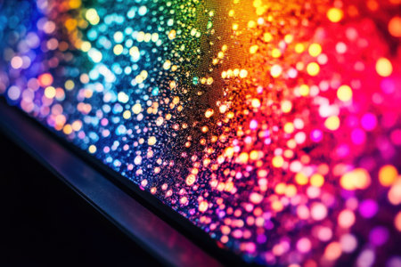 Bright, colorful bokeh lights create a stunning visual effect on a dark surface at night.