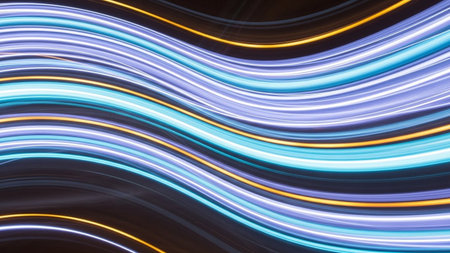 Vibrant cyan, purple, and gold neon light streaks flow dynamically in curved lines, creating a sense of speed and...