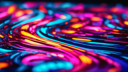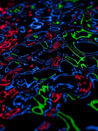 A dark, fluid surface with glowing neon lines of blue, red, and green creates a rippling abstract texture and pattern.