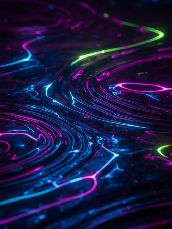 Digital showing abstract dark surface with swirling patterns and bright neon lines of blue pink and green light creating a futuristic digital texture.
