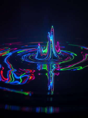 A abstract pattern resembling sound waves or liquid ripples, rendered in vibrant neon blue, green, and pink, glows on a dark, reflective surface.