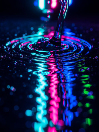 Vibrant neon pink, blue, and green lights reflect on a dark surface as liquid is poured, creating concentric ripples and dynamic splashes.