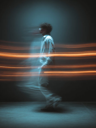 A person walks quickly indoors as light trails blur around them, showing movement and speed in a dark setting.