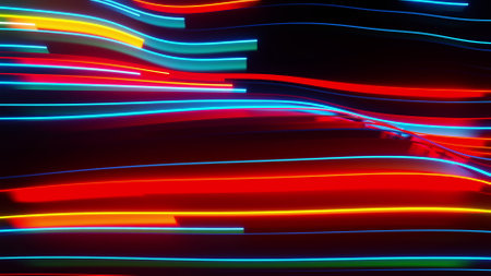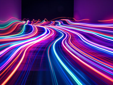 Colorful light trails in motion, vibrant neon streaks creating an energetic and dynamic abstract background