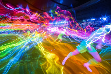 An electric soccer arena--waves of neon colors surge around the pitch.