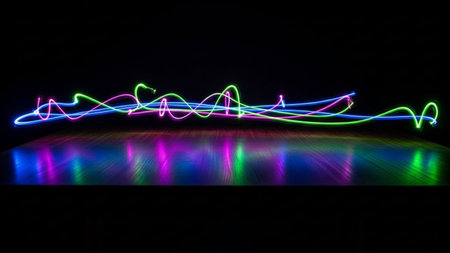 is a vibrant example of light painting, created using long exposure It a series of dynamic, colorful light trails in neon green, pink, and blue, swirling and curving across a dark background. The light trails are cast upon a reflective surface, likely a wooden table, which mirrors the colors and adds depth to the composition. The contrast between the bright, energetic light lines and the dark surroundings creates a striking visual effect. The evokes a sense of movement, creativity, and...