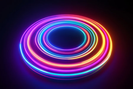 Vibrant and alluring concentric neon rings radiate a glowing light in darkness, producing an absolutely mesmerizing circular display that bursts with multicolored energy and captivating beauty