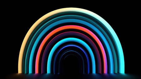 Symmetrical rainbow neon light arch with perfect mirror reflection creating stunning visual effect on black background in contemporary digital art.