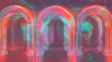 A stunning neon tunnel installation featuring glowing rainbow arcs that create vibrant and immersive atmosphere spacious, modern gallery. arches illuminate brick walls, enhancing artistic experience