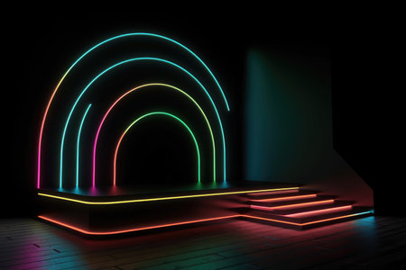 Black stage background with neon lamp. Glowing futuristic product display stand podium Against Background, neon geometric shape for product display presentation. Generative AI.