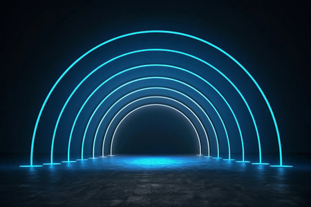This image showcases vibrant neon arches in blue and pink hues, illuminating a dark room with a smooth floor, creating a captivating and modern ambiance.