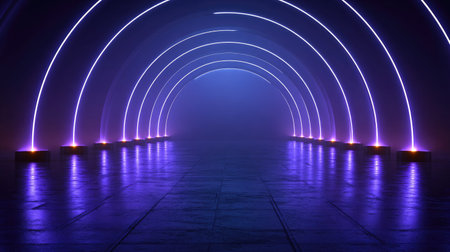 Captivating view of a futuristic archway illuminated with neon lights in a foggy space, creating an ethereal ambiance perfect for creative projects or modern designs.