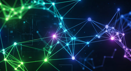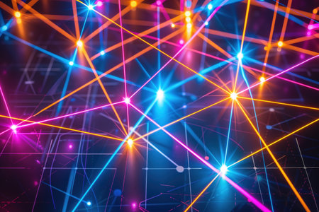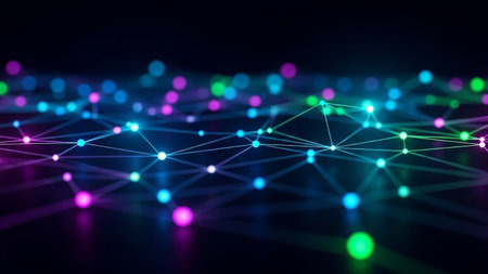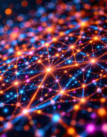 This visually stunning abstract image showcases a network of colorful nodes and vibrant lines on a dark background, symbolizing connectivity and technology.