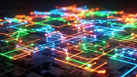 Colorful neon pathways intertwine in a complex circuit arrangement showing advanced technology.