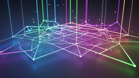 A luminous network of interconnected lines and nodes in various bright colors creates an abstract representation of data and technology.
