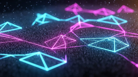 A dark, textured surface is illuminated by a network of glowing neon geometric shapes in blue and pink, with small particles scattered throughout the scene.