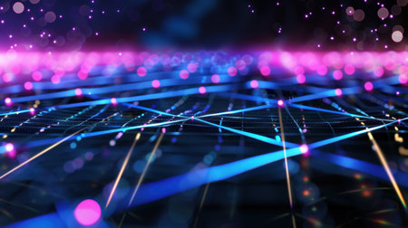 An abstract digital landscape featuring glowing lines and colorful bokeh lights in vibrant pink and blue. The design evokes a sense of depth and energy, perfect for tech and art projects.