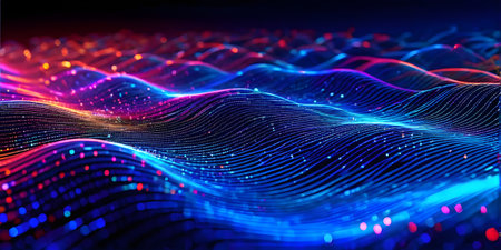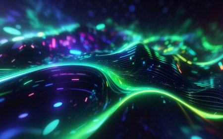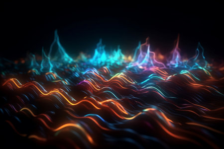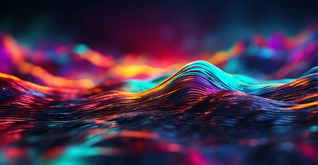 An abstract digital illustration showcases a flowing wave design, rendered in vibrant neon colors against a dark backdrop. The composition features dynamic lines and curves, creating a sense of movement and energy. Suitable for use in various visual communications, the design offers potential applications in modern design and technological projects.